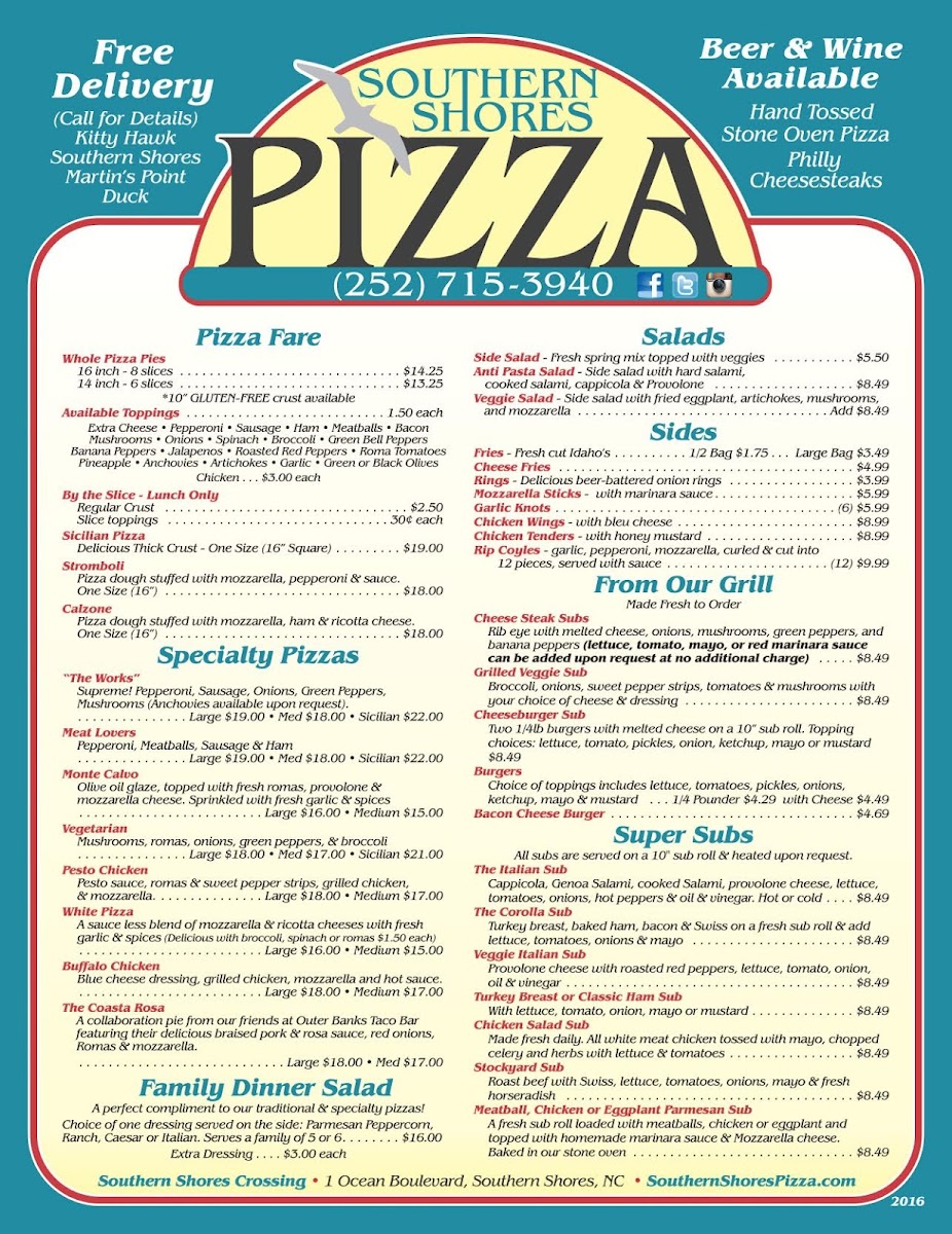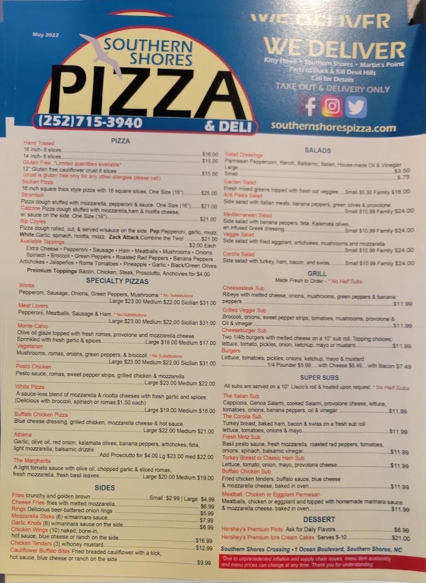 If you're craving a delicious meal in Southern Shores, NC, look no further than Southern Shores Pizza & Deli Menu. Nestled at 1 Ocean Blvd Suite 106, this local gem offers a wide variety of mouthwatering dishes that will satisfy every taste. Whether you're in the mood for a classic pizza with your favorite toppings or a fresh deli sandwich, they've got you covered. The menu features a mix of hearty options, from cheesy, oven-baked pizzas to crisp salads, making it the perfect spot for any casual outing. Not only is the food top-notch, but the relaxed, friendly atmosphere makes it an ideal place for both locals and visitors to enjoy a meal. So, swing by, grab a bite, and experience a taste of Southern Shores like never before.